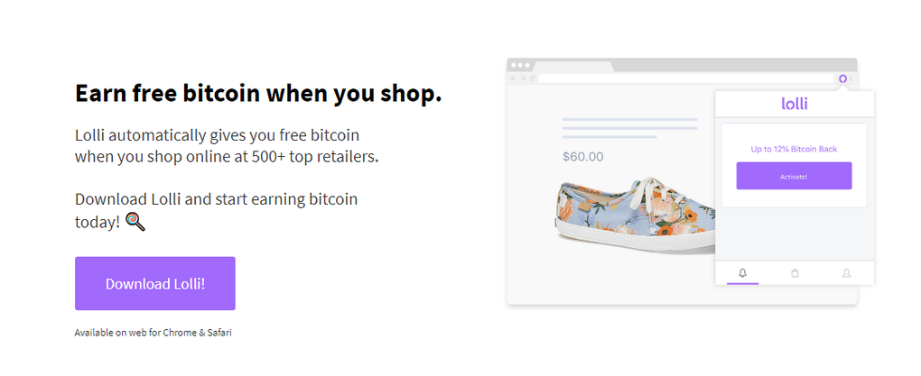 Lolli es una extensión de navegador compatible con Google Chrome y Mozilla Firefox que te brinda la posibilidad de ganar bitcoins al comprar cualquier producto en cualquiera de las más de 500 tiendas minoristas asociadas a su plataforma como, por ejemplo, Groupon, Casper y SeatGeek. En el momento en el que realices una compra en cualquiera de ellos, te avisará automáticamente de la cifra de bitcoins que has conseguido y los añadirá automáticamente a tu monedero virtual.